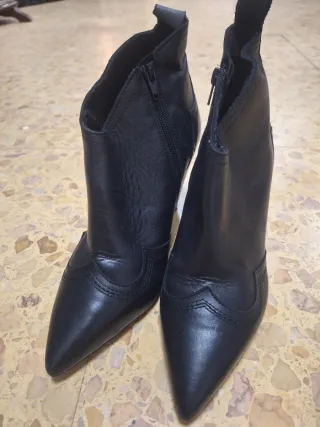 Elegantes botas de tacón alto. - Material: Piel. - Cierre de cremallera lateral. - Punta afilada. - Detalle de pespuntes decorativos en la puntera.
