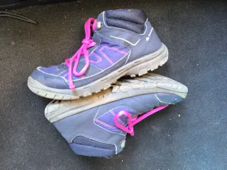 Zapatillas de montaña de la marca Quechua en talla 38. - Combinación de colores azul y morado. - Diseño de caña alta para mayor sujeción. - Cordones de ajuste en color fucsia.