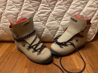 Botas de montaña Asolo de caña alta, ideales para terrenos exigentes con nieve. Diseñadas para ofrecer soporte y protección. - Color beige con detalles en rojo. - Cierre con cordones. - Suela de goma. - Talla 4 1/2 (equivale 37-37,5)