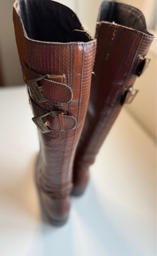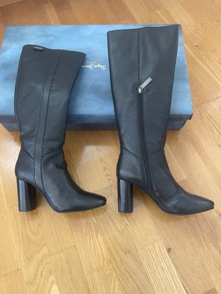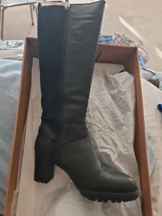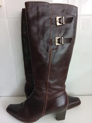 Elegantes botas altas de piel para mujer, de alta calidad, caña alta, detalle de hebilla, punta fina y tacón estilizado pero muy buena piel y cómodas, por un problema medico , no me las puedo poner.