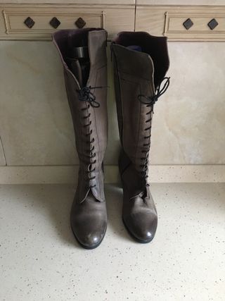 Botas altas de piel en color gris. Puestas tres veces. - Cierre de cordones. - Detalle de cremallera lateral. - Diseño elegante.
