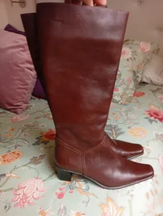 Botas altas marrones de piel, suelas practicamente nuevas por poco uso. Numero 40. Reforzadas en el talon. Alto de tacon 8 cm. Ancho de genelo 20cm.