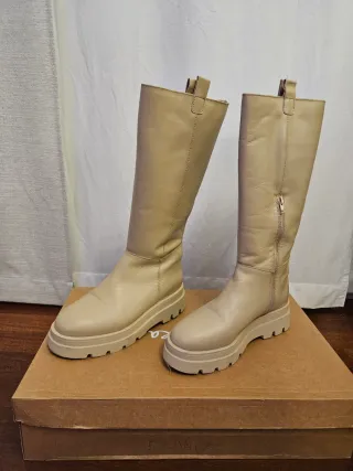 botas altas de piel por el interior y exterior, color camel/miel. Calidad de la piel alta, blanda. Las vendo porque me quedan pequeñas. Muy poco usadas. tienen las puntas ligeramente tocadas, se ve en las fotos. Preciosas y sientan muy bien a la pierna. Precio original superior a 200 euros