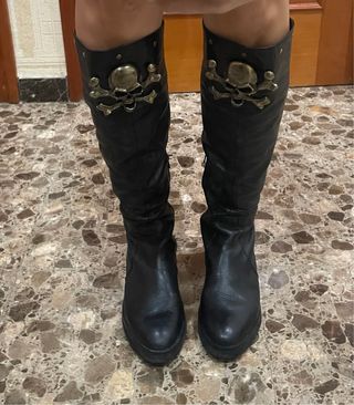 Botas altas de estilo pirata con calavera. Son dos botas negras de tacón. - Material: piel sintética con textura de cocodrilo. - Diseño llamativo con calavera dorada en hebilla. - Tacón grueso y cómodo. - Ideales para eventos especiales o para un look rockero.