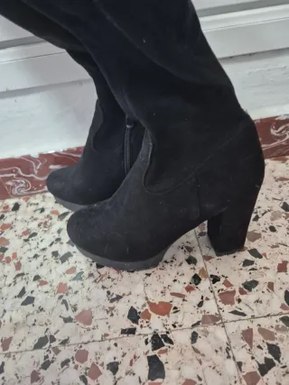 Botas altas de estilo moderno. - Material exterior tipo ante. - Tacón grueso y plataforma delantera. - Caña alta que llega por encima de la rodilla. Usadas una vez