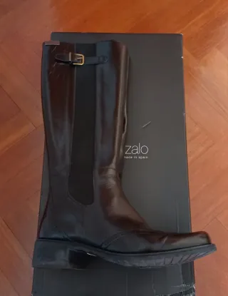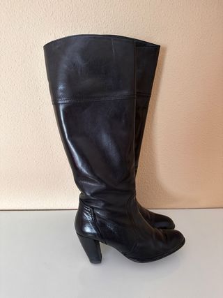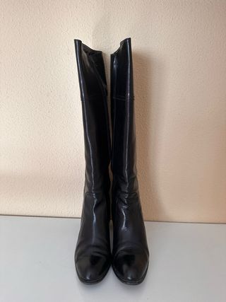 Botas altas de color negro, talla 38, con poco uso. - Diseño elegante y versátil. - Cremallera lateral para facilitar su uso. - Detalle de hebilla metálica en la zona del tobillo. - Paneles elásticos en la parte trasera de la caña para un mejor ajuste.