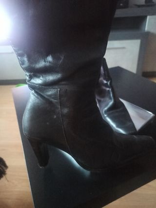 Botas altas negra de talla 39 Tiene un tacon de 5m Del tacon a la parte superior de la caña mide unos 43cm aprox.