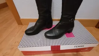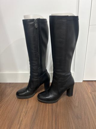 Elegantes botas altas de piel/cuero. - Cierre de cremallera lateral. - Tacón grueso con plataforma goma extra cómoda. - Diseño de caña alta parte gemelo piel blanda para mas comodidad. Me las he puesto en un par de ocasiones, están como nuevas. Costaron 151€ rebajadas (precio original 189€). Se venden con caja original.