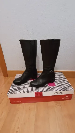 Botas altas de piel de la marca Fluchos. - Color negro. - Detalle de hebilla metálica en el tobillo. - Cierre con cremallera lateral. - Tacón bajo y cómodo. - Plantilla extraíble.