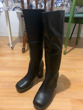 Vendo estas preciosas botas negras altas con plataforma, usadas muy pocas veces. Se ajustan perfectamente a la pierna, estilizando la figura, y además son súper cómodas. Por dentro, son calentitas, ideales para los días fríos.