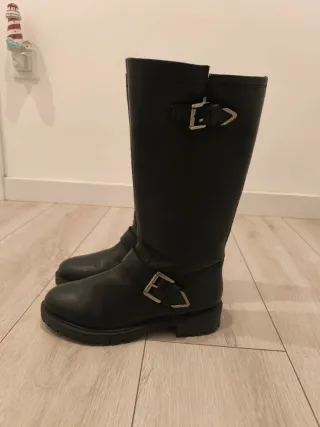 Botas altas de cuero negro con un diseño moderno y detalles metálicos. - Cierre con hebilla decorativa. - Caña alta hasta la rodilla. - Suela gruesa y resistente. - Con forro interior para el frio
