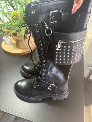 Botas altas de estilo motero con detalles llamativos. - Cierre de cordones. - Hebillas decorativas. - Bolsillo lateral con cremallera y tachuelas. - Suela gruesa. -Usadas una vez, posibilidad de quitar bolsillo. Interior forrado de pelo.
