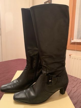 Botas caña alta de cuero genuíno ligeramente granulado color negro. Hebilla en talón. Son comodísimas: tacón de 8cm y suplemento de 1cm. Altura caña 38cm. Contorno caña 42cm. Son un 39 amplio, valdrían para talla 39 y 40.