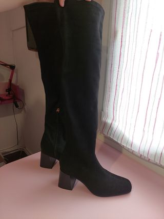 Botas altas de ante negro, talla 40. Son ideales para cualquier ocasión. - Tacón cómodo mide 10 cm - medida total de la bota 69 cm - Material suave y agradable al tacto. - Perfecto estado. SOLO 1 puesta