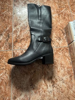 Botas altas de caña ancha, nuevas a estrenar con etiqueta. - Diseño elegante y moderno. - Cierre con hebillas decorativas. - Detalle elástico en la caña para mejor ajuste. Para piernas muy anchas