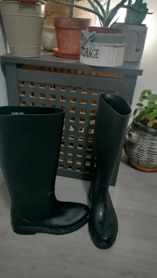Botas de agua altas hasta la rodilla, en color negro, casi nuevas y en perfecto estado. - Diseño alto. - Poco uso.