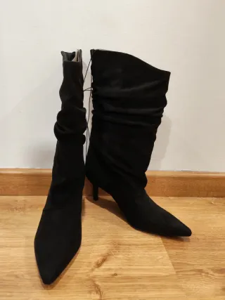 Botas altas de antelina en color negro sin estrenar, debido a que se ha pasado el tiempo de devolución, le rebajo el precio ya que no se pueden cambiar. - Diseño de caña arrugada y ancha. - Llegan al gemelo. - Tacón fino. - Punta afilada. - Altura de tacón 6 cm.