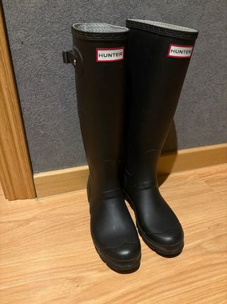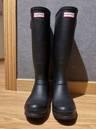 Botas de agua altas de la marca Hunter en color negro mate. Perfectas para días de lluvia o actividades al aire libre. SE INCLUYEN CALCETINES. Las botas no tienen mucho uso porque me quedan un poco justas pero tienen roce de quitármelas (se ve en una de las fotos).