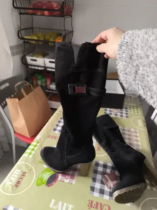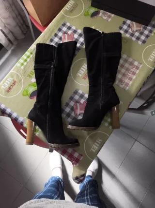 Botas altas de estilo moderno. - Material de ante. - Tacón grueso. - Detalle de cordón en la parte superior. - Talla 39 pero yo llevo la 38 y me están bien. - Tiene una pequeña marca en la parte superior de una bota que se ve en la última foto. - Prácticamente sin usar.