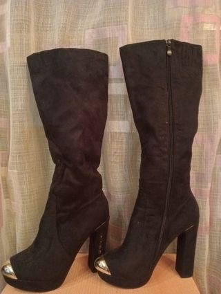Preciosa botas negras altas hasta la rodilla, de tela, muy cómodas y casi nuevas, compradas Corte Inglés. Tacón alto de 9 cm. Caña de 60 cm.