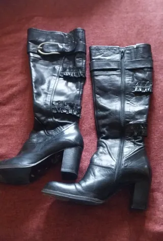 Botas altas de cuero con un diseño elegante y detalles únicos.Poco usadas,,altura tacón 7cm altura bota desde el.suelo 46 cm - Material: Cuero. - Cierre de cremallera. - Detalle de hebilla. - Adorno de volantes.