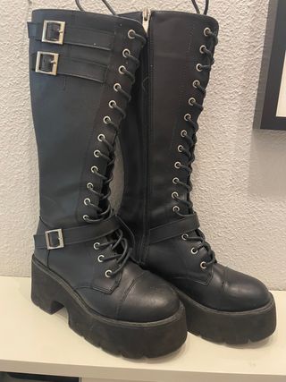 Botas altas de plataforma, color negro. Ideales para un look rockero. - Material: Sintético. - Cierre: Cremallera lateral y cordones. - Altura de la caña: Alta. - Tacón: Plataforma gruesa.