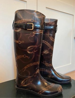 Botas de lluvia Ralph Lauren, elegantes y en perfecto estado. Son altas, llegan a la rodilla, y tienen un diseño precioso con estampado de cadenas doradas sobre fondo negro. - Diseño con hebilla. - Estampado de cadenas doradas sobre fondo negro. - Material de goma resistente. -Se entrega con caja original -precio negociable