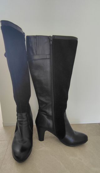 Botas altas de caña ancha. Combinación de piel y ante color negro. Excelente estado, puesta una sola vez. Marca Tolino ancho-3. Tacón 8 cm aprox.