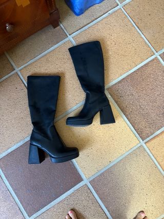 Botas altas de ante negras, con plataforma , son muy cómodas y son elásticas. Quedan por encima de la rodilla , llegan hasta el muslo. Se cierran con cremallera por detrás y sin ningún roce. No se rebajan.