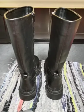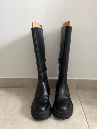 Botas altas de caña alta en color negro. - Diseño moderno con suela track. - Material exterior de piel. - Cierre lateral con cremallera. Usadas una vez, se puede apreciar en las fotos de la suela. Sin roces ni desperfectos.
