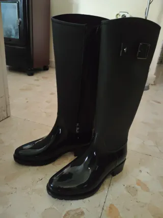 Botas de agua altas de color negro. Perfectas para días de lluvia o para actividades al aire libre. - Material de goma. - Suela con buen agarre. - Diseño clásico y funcional.