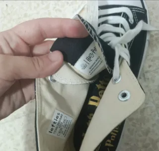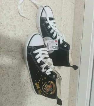 Botas altas de estilo deportivo con temática de Harry Potter. Perfectas para los fans de la saga. - Diseño en color negro con detalles multicolor. - Estampado del escudo de Hogwarts y Harry Potter. - Cierre con cordones blancos. - Caña alta.