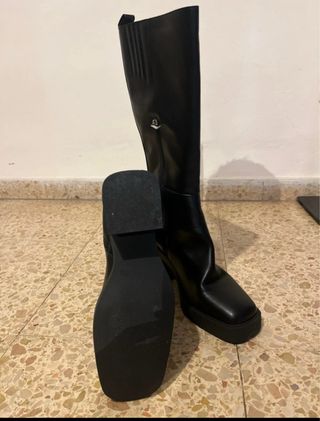 Botas negras de piel, caña alta y tacón grueso, de Mango. tacón: 9 cm Puestas en dos ocasiones pero el tacón es demasiado alto para mí. Talla 41, calzan bien. Adjunto fotos de detalles.