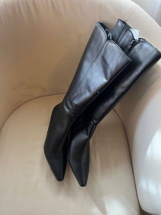 Elegantes botas altas de piel, perfectas para completar cualquier atuendo. - Cierre de cremallera lateral. - Tacón fino y punta afilada. - Diseño clásico y versátil. - altura de tacón 7cm -caña altura 37cm y ancho 40cm