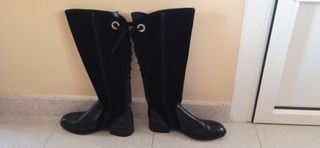 Botas altas negras de ante y piel, talla 37. Ideales para el otoño-invierno. - Diseño elegante y versátil. - Cierre de cordones en la parte trasera. - Material combinado de ante y piel. - Fabricación española.