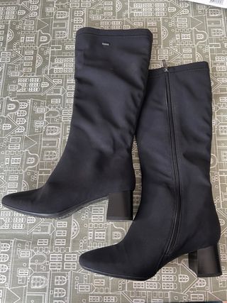 Botas altas negras de tacón, talla 40. Tipo calcetín. - Material: tejido elástico - Altura del tacón: 8'5 cm - Diseño: de caña alta, con puntera cuadrada.