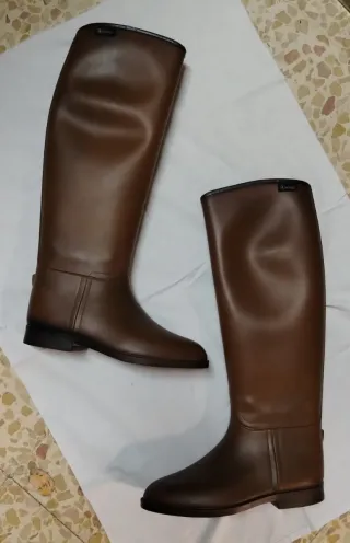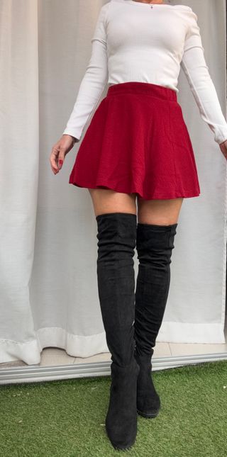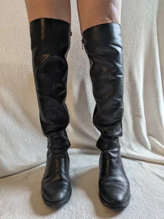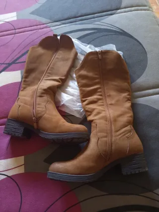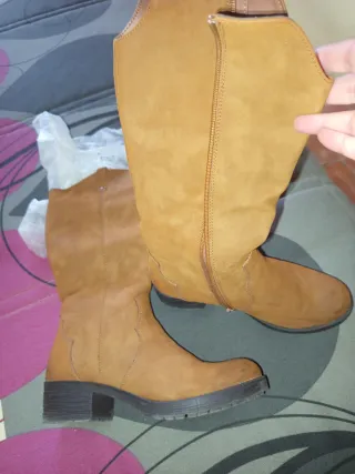 Botas altas de estilo informal. - Material exterior tipo ante. - Caña holgada y arrugada. - Diseño de punta redonda. - Suela plana. Solo lo he usado la vez de la foto, tengo el pie ancho y me aprietan.