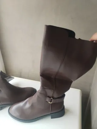 Botas altas de ante color marrón. Perfectas para el día a día. -Talka grande ya que uso un 39 y es un 38 - Cierre con cremallera. - Detalle de tira con botón en la parte superior. - Suela plana.