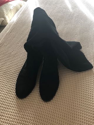 Botas altas de mujer, estilo mosquetera. Son de color negro elástico parte de atrás y cremallera lateral . - Material: antelina - Altura: por encima de la rodilla. - Tacón: plano.