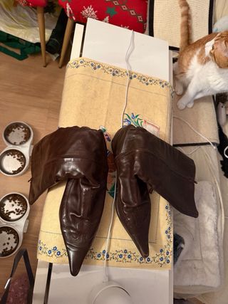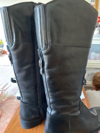 Botas altas de cuero negro. Planas. De piel de gran calidad, fina y resistente, tambien por la parte interior. - Cierre de cremallera lateral por la parte interna. - Diseño clásico y elegante. Recomiendo para pies mas bien estrechos y piernas delgadas, mirad medidas de la caña. Yo he engordado y no me cierran por la parte superior. Compradas en el Corte Inglés por 260 euros.