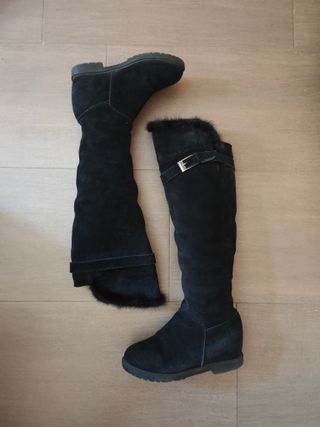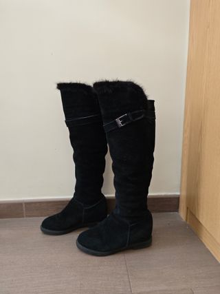 Botas altas de ante con un suave forro de pelo. - Material exterior de ante. - Detalle de pelo en el borde superior. - Hebilla decorativa en la parte superior. Botas altas de ante negro, de excelente calidad, muy muy calientes, ideales para invierno frío ❄️El interior está completamente forrado de pelo grueso y suave, proporcionando un abrigo excepcional. Altura: llegan justo por debajo de la rodilla Muy cómodas y elegantes 🔹 Único defecto: En el interior hay ligero desprendimiento del cuero, no visible desde el exterior y no afecta al uso ni