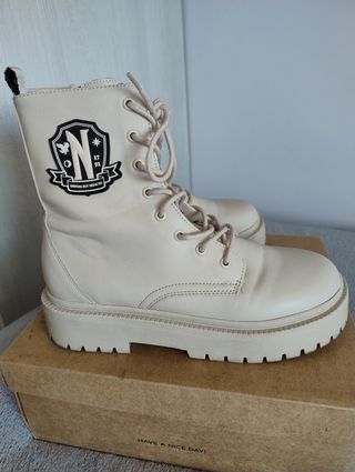Botas altas de Zara, modelo "Wednesday" en color beige, talla 37. Son de estilo casual y tienen un diseño elegante. - Tienen cordones y cremallera lateral. - Suela gruesa. - Material: sintético. En perfecto estado!!
