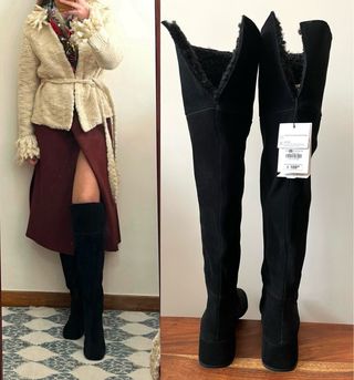 Botas altas de piel vuelta en color negro. - Muy cómodas. - Son de Zara. - Diseño mosquetero. - Tacón bajo. - Cierre de cremallera lateral.