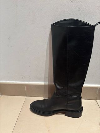Botas altas de la marca Zara en color negro. - Diseño elegante y versátil. - Cierre lateral. - Detalle de tira en la parte superior.