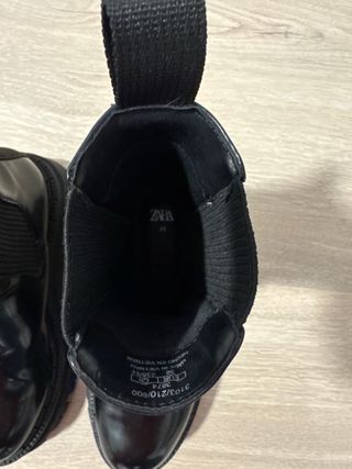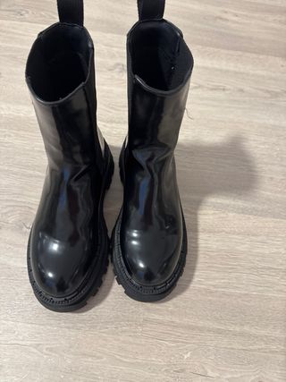 Botas de estilo Chelsea de Zara en color negro. Son unas botas altas con suela track y detalle elástico en los laterales. - Material exterior: sintético. - Material interior: textil. - Suela de goma. - Altura de la caña: 15 cm aprox. - Altura de la suela: 4 cm aprox.