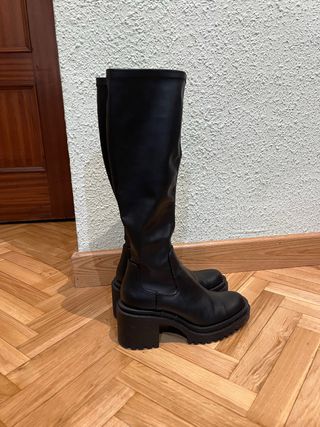 Botas por encima de la rodilla, Zara Trafaluc. Talla 36. Confeccionadas en tejido elástico negro que se ajusta perfectamente a la pierna. Llevan puntera reforzada en contraste y suela track, con un diseño cómodo y moderno. Cuentan con cremallera lateral interior para facilitar el calce.