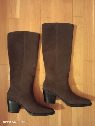 Botas altas de nobuk con tacón de 6,5 cm. Nuevas. Sin cremallera. Color marrón. Tirilla para sacarlas con facilidad. Estado perfecto - Material exterior: Nobuk. - Color: Marrón. - Diseño de tacón grueso.