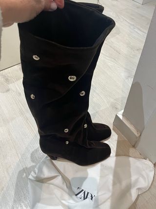 Botas altas de la marca Zara en color marrón. Un diseño elegante y versátil. - Detalle de adornos plateados. - Tacón bajo y cómodo. - Material suave al tacto. Solo una puesta