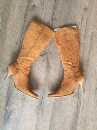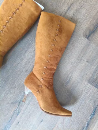 Vendo elegantes botas altas para mujer en color beige (tono arena/taupe), ideales para otoño e invierno. Tienen un diseño de punta cuadrada y tacón bloque, siguiendo las últimas tendencias de moda.Talla: 38. Material: Acabado tipo antelina/ante sintético, muy suave al tacto. Detalles: * Cierre de cremallera lateral completa para mayor comodidad. Tacón ancho de altura media (muy estables y cómodas para caminar). Caña alta con ajuste elástico que se adapta bien a la pierna. Interior forrado en tela suave. Perfectas para combinar con faldas, vestidos o pantalones por dentro. ¡Están nuevas!