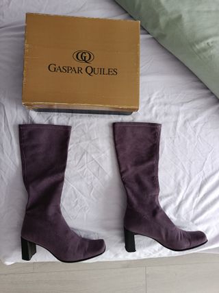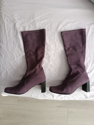Botas altas de tacón en color morado. - Material tipo ante. - Tacón cuadrado y grueso. - Diseño ajustado a la pierna.